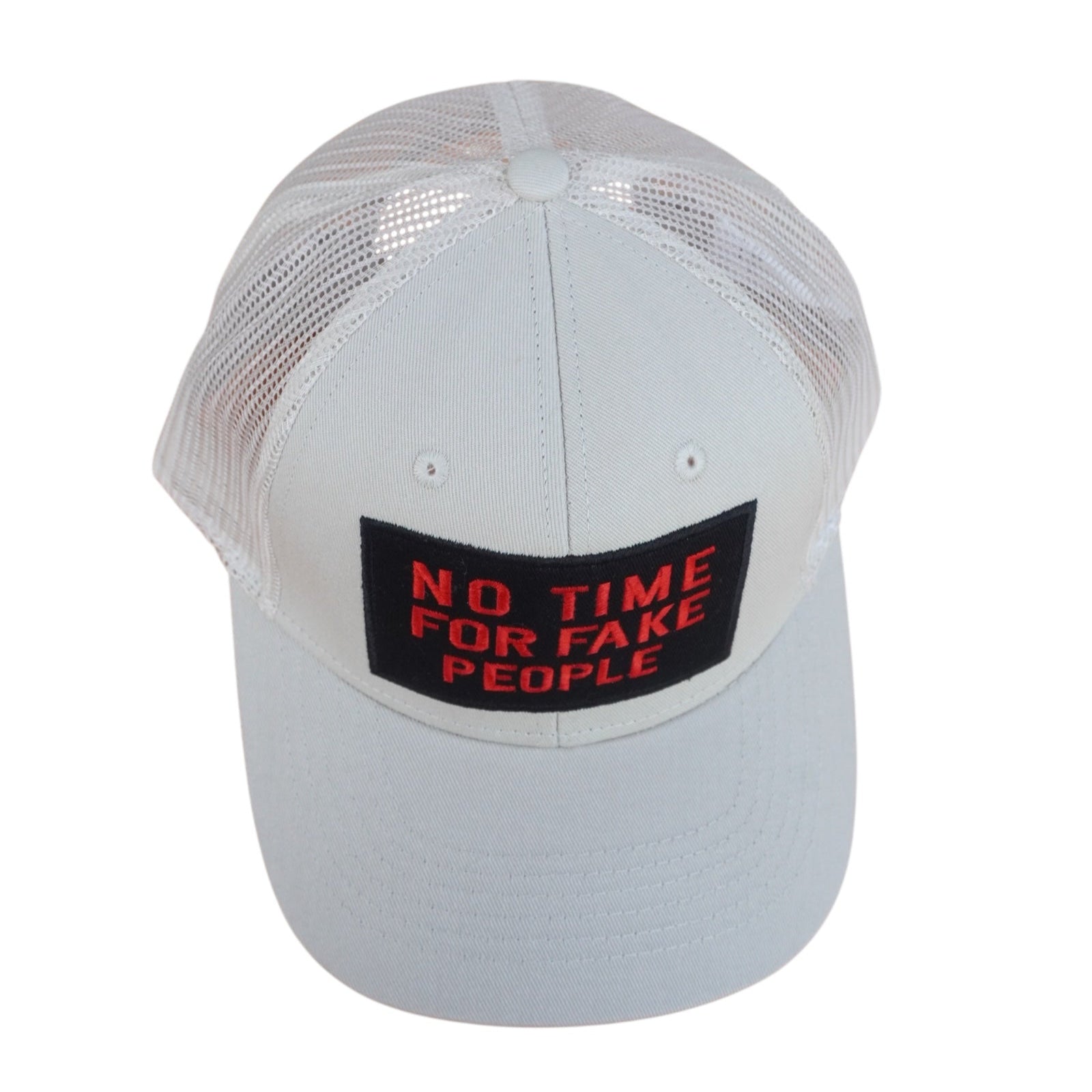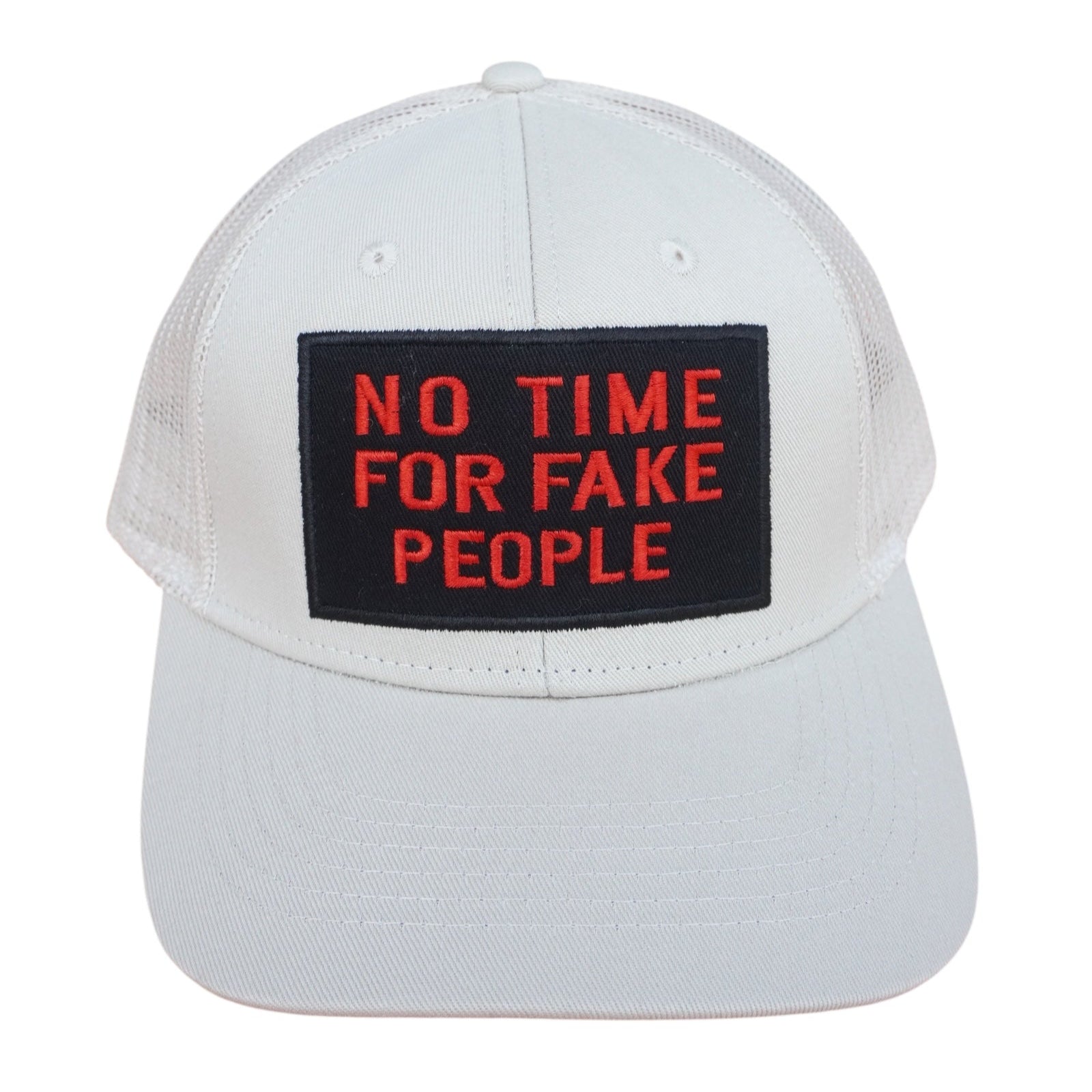 Embroidered “NO TIME FOR FAKE PEOPLE” on the front